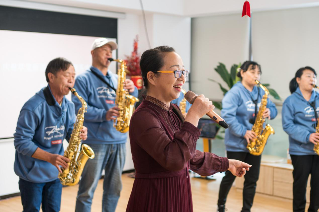 △居民在草堂街道悅倫康養(yǎng)居多功能廳表演